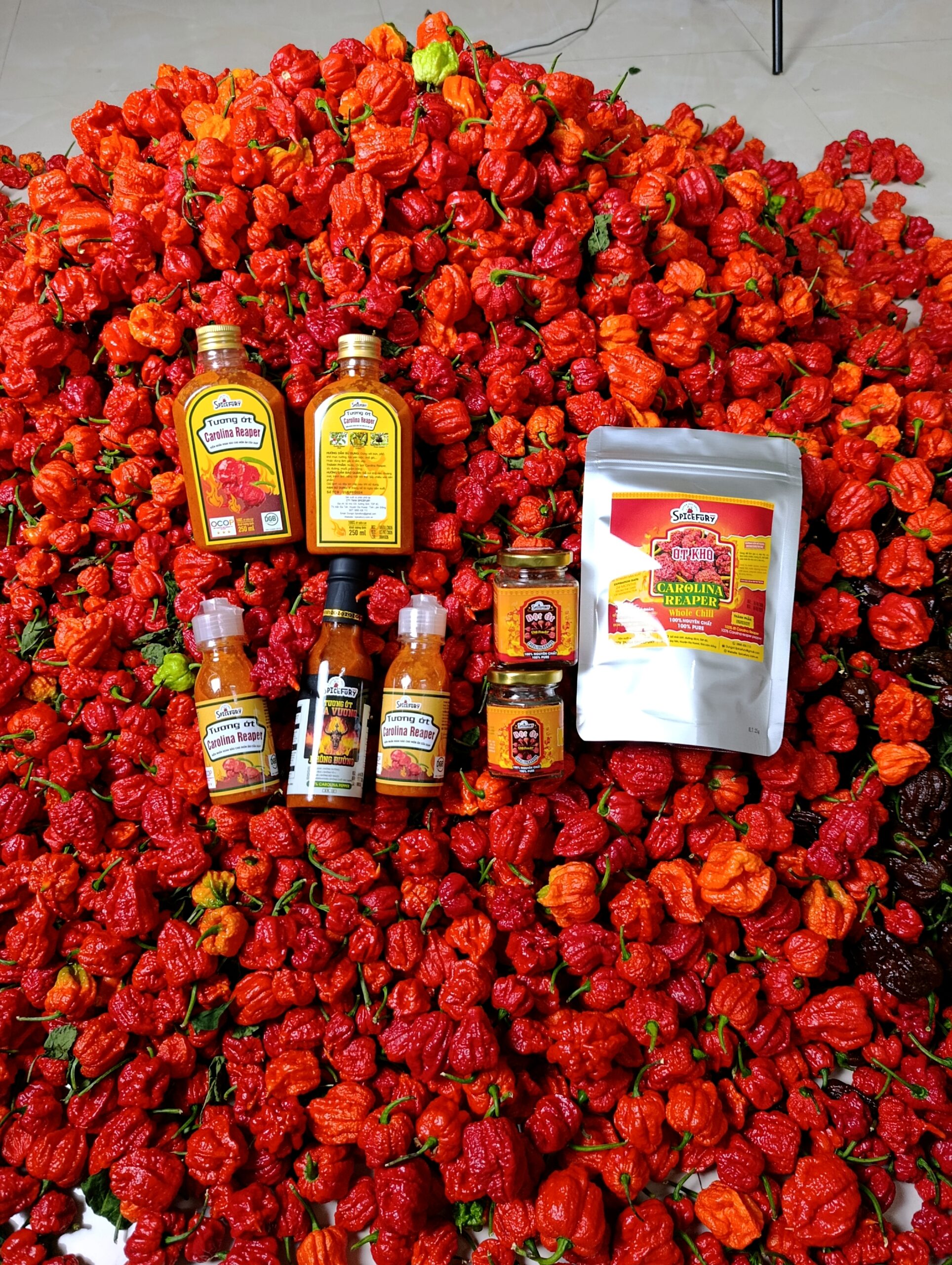 - ỚT KHÔ CAROLINA REAPER – SIÊU CAY NGUYÊN QUẢỚt Carolina Reaper từng đạt kỷ lục Guinness 2013 với độ cay lên đến 2.200.000SHU. Sản phẩm được thu hoạch từ những quả ớt chín, chọn lọc và sấy nguyên trái ở nhiệt độ tối ưu, giúp giữ trọn mùi thơm – vị cay – màu sắc tự nhiên.⭐ Điểm nổi bậtĐộ cay cực mạnh, phù hợp cho người thích ăn cay thật sự.